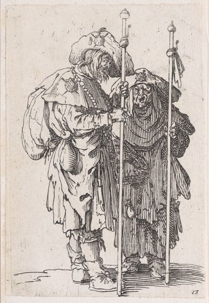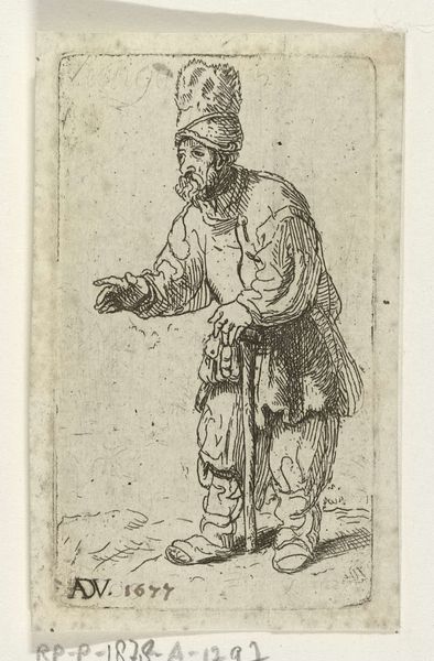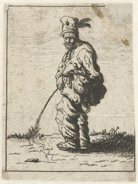 Curator: Here we have a print, "Reverse Copy of Le Gueux Assis et Mangeant (The Beggar Sitting and Eating)," part of "Les Gueux suite appellée aussi Les Mendiants" from circa 1625-1700, currently held in the collection of the Metropolitan Museum. Editor: There's something immediately compelling in the raw, etched lines. It speaks to a sense of stark simplicity, almost bleakness. The monochromatic palette and concentrated focus certainly draw me into this lone figure. Curator: The artist, an anonymous master printmaker of the Baroque, captures something universal. Beggars often act as cultural symbols representing marginality. Here, we find echoes of social commentary deeply entrenched within art history, particularly in early modern Europe. Editor: The formal elements certainly emphasize his isolation. The figure is predominantly lines creating shadow, but his face has minimal detailing. The diagonal line of the staff and slumped posture create dynamic yet melancholic lines—the work exemplifies the Baroque through this dynamism, though with an intriguing understatement, wouldn't you agree? Curator: Absolutely. Beyond the lines and shadows, the bowl—the offering or taking of sustenance—serves as a powerful symbol. This man becomes an allegory for the basic human condition: the necessity for food, the reliance on charity or his own means of procuring the meal. His clothes, his posture, it’s all telling a familiar story about those on the fringes. Editor: It's striking how this relatively small print—likely an etching given the line quality—achieves such a monumental feeling through compositional strength. I also note that the copy is reversed, meaning there's likely another image from where the print comes from. This only shows the chain of images and visual representations surrounding the figure of the "beggar". It feels like a sign. Curator: Signs and symbols indeed! The very act of eating in such a state also reminds us of the body—the inherent vulnerability that connects all social strata in an unavoidable truth. He is all of us at our most basic need. Editor: So even in a simple form, a simple linear configuration of someone sitting eating can reveal a far bigger symbolic web. It really underlines the expressive power within seemingly simple compositions. Curator: It does indeed. The visual vocabulary of the time is imbued within it, constantly building upon layers of existing symbols. Editor: A fantastic insight! Thank you.