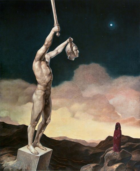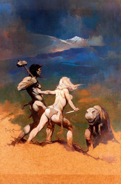 Editor: So, this is Frank Frazetta's 1966 oil painting, "Tomorrow Midnight," a paperback cover. I'm struck by its isolation. The man and his…companions look weary, stranded against this vast, starry backdrop. What do you see in this piece? Curator: The solitude definitely speaks volumes, doesn’t it? The symbolism here resonates with classic heroic narratives – the lone wanderer, the faithful animal companions. But Frazetta twists it. Notice the planet, almost an omen hanging overhead, and that mysterious brown structure. It pulls the eye – promising what? Sanctuary, perhaps? Or further trials? It’s a masterful use of iconic elements turned slightly askew. The question I have is what do you think these images suggest? Are these symbols specific to science fiction or more broadly symbolic? Editor: Hmm, I suppose they tap into very old stories about journeys and helpers. The bandaged foot hints at vulnerability. Maybe the creatures aren't just sci-fi; they’re versions of animal guides from mythology? Curator: Precisely. The imagery speaks to a very old and pervasive narrative archetype. What culture doesn’t have stories of solitary figures, testing their strength? And do you think the cover works by giving enough to tempt a reader, but not giving too much away? Editor: Absolutely. The vulnerability makes him relatable. You see the vastness of space but it seems intimate. The imagery almost seems to ask more questions than it answers! Curator: That is what elevates Frazetta, isn't it? By drawing on symbolic language and the idea of our shared experience, Frazetta transcends simple fantasy illustration. He evokes a deeper, primal connection. Editor: I hadn't really considered all the historical connections beneath the surface of the science fiction elements, which definitely helps you look closer and think. Thanks!