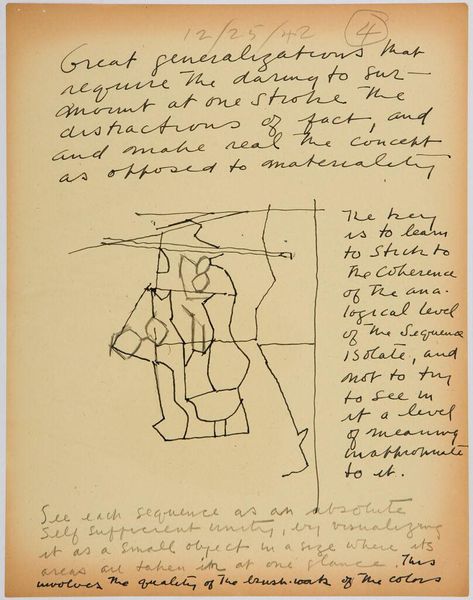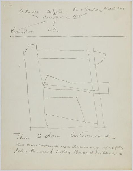 Curator: Here we have Stuart Davis's "Configuration Diagram," a sketch that offers insight into his compositional process. Editor: It feels so raw, doesn't it? Like a peek into the artist's mind as he's actively working through a puzzle. The lines are tentative, the notes scribbled... it's very intimate. Curator: Exactly. This diagram reveals Davis's deep engagement with abstraction and his careful consideration of spatial relationships. Notice how he's mapping out ratios and configurations. Editor: I'm struck by the sheer intellectual energy contained in this small work. It's more than just a diagram; it's a record of the artist's thought process, a moment of creative struggle. Curator: The sketch highlights Davis's analytical approach, using geometric forms to construct dynamic compositions in an era of experimentation. Editor: It makes you wonder about the final piece. Was it worth all the math? Was it beautiful? It's an intriguing mystery!