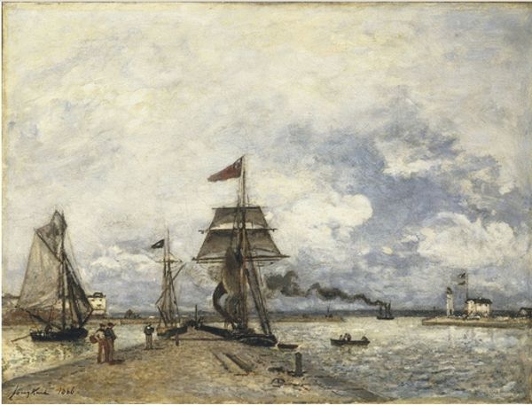 Eugène Boudin captured the Channel at Allée Verte in Brussels with oil on canvas. This painting offers a glimpse into the changing social and economic landscape of 19th-century Europe. Boudin, a French artist, often depicted scenes of harbors and coasts, reflecting the growing importance of maritime trade and leisure. Here, we see a busy channel with various boats, suggesting bustling commerce and transportation networks. Brussels, as a major European capital, was deeply involved in these developments. The "Allée Verte," or green avenue, was a popular promenade, indicating the rise of public spaces for recreation and social interaction among the bourgeoisie. Boudin's focus on capturing the atmosphere and light aligns with the Impressionist movement, which challenged traditional academic art by prioritizing immediate sensory experience. By studying the history of urban development, transportation, and leisure activities, we can better understand the cultural context that shaped Boudin's artistic vision.