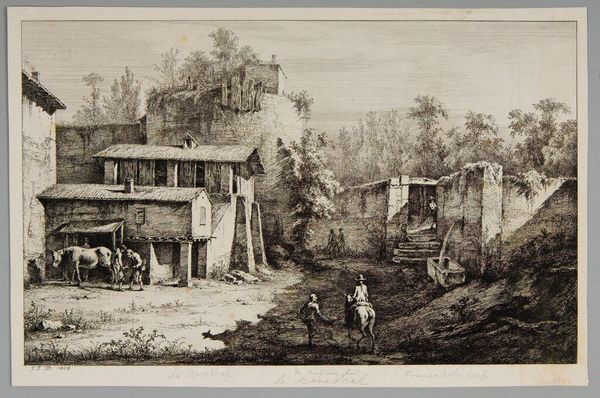 Giovanni Battista Piranesi created this etching of the entrance to Pompeii, capturing a scene where ruins blend with everyday life. Notice the dramatic contrast of light and shadow that sculpts the ancient stones. The deep blacks carve out the textures of the ruins, creating a palpable sense of depth. Piranesi organizes the scene around a central vanishing point, drawing our eyes toward the distant landscape, framed by crumbling walls. The figures in the foreground, rendered with a delicate touch, seem almost ghostly, caught in the stasis of the past. Piranesi’s focus isn't just architectural recording; it’s a meditation on time, decay, and the sublime. The etching plays with the contrast between the enduring stone and the transient human presence. This contrast prompts us to reflect on how we perceive and engage with history. It acknowledges the layers of time, inviting us to question the permanence of our structures and the narratives they carry.