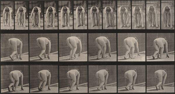 This is “Plate Number 182. Crawling on hands and knees,” made by Eadweard Muybridge sometime in the late 19th century, using photographic processes. At first glance, this series of photographs may seem purely scientific. But consider the labor involved. Each image required the subject to strike a pose, and for Muybridge to meticulously capture and develop each photograph. Taken together, they offer a groundbreaking study of human movement. The materiality of photography itself is crucial here. Each gelatin silver print, carefully arranged on a large sheet, freezes a moment in time, yet invites us to perceive movement. The stark contrast and crisp details emphasize the human form, while the grid format underscores the clinical, almost industrial, nature of Muybridge's project. Ultimately, this work challenges our assumptions about art, science, and labor. Is it a study of human locomotion, or a commentary on the human body reduced to a series of data points? Perhaps it's both, reminding us that even the most scientific endeavors are shaped by human hands and social contexts.