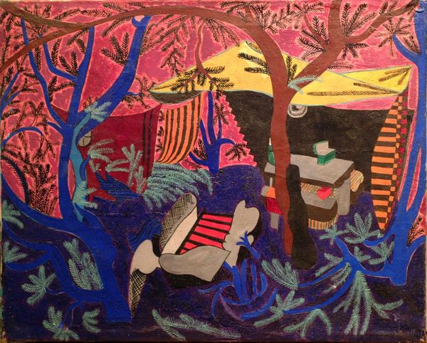 Curator: Looking at Kinder Album's "Untitled" piece from 2018, I'm struck by the vibrant, almost childlike quality of the rendering. Editor: Yes, it certainly possesses an immediacy and rawness in its making. I'm interested in the artist’s deliberate use of what seems to be a combination of drawing and acrylic. The interplay between the drawn line and blocks of vivid colour generates a fascinating tension in the composition. Is this artist questioning traditional hierarchical modes? Curator: That's an astute observation. I think part of the piece’s intrigue lies in its subversion of typical landscape depictions. We have a figuration nestled amongst the trees, seemingly unconcerned by the viewer's gaze. Considering its style, one can assume the work offers an intimate portrayal, as much as a comment on broader themes like nature versus humanity and maybe questioning social constraints surrounding the body. Editor: I'm wondering if it's an ironic twist on erotic art, a comment on the way art institutions have historically displayed and commodified the body. The choice of the wooded setting and deliberately crude style are compelling! I am wondering why the figure has a hiking boot, and why is she hiding? What is the artist doing here? Is it a commentary on nature? Curator: That's a crucial question! I suspect the work intentionally blends genres, juxtaposing naturalistic elements with explicit subject matter and a crude or naive, if you want, handling of materials. The social message in itself appears as an act of protest against rigid moral systems or any traditional canons related to beauty, style, gender roles and art history. Editor: So you’re saying the "amateur" qualities can offer subversive content against conventions? I hadn’t quite viewed it like that, but that perspective really adds another layer to the work! Curator: Precisely. What appeared almost childlike at first glance opens to deeper scrutiny and makes for powerful contemporary commentary. Editor: Thank you!