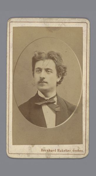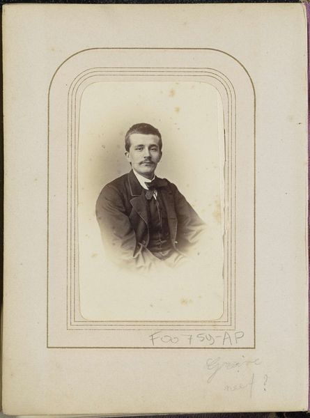 Curator: Here we have an intriguing portrait, "Portret van een man aangeduid als Hilverdink (zoon)," created sometime between 1863 and 1879. It's a gelatin-silver print, held in the collection of the Rijksmuseum, by Theodor Brüggemann. Editor: The sitter's intense gaze is compelling, and there’s almost a slight melancholy about his expression. It seems characteristic of early portrait photography and hints at the performance of Victorian masculinity. Curator: That performance is interesting. Early photography carried the symbolic weight of memorialization. These portraits acted as relics of a specific moment and were intended to convey more than just the person's likeness. His attire, the bow tie, is a marker of status but perhaps also of cultivated intelligence, or artistic sensibility. Editor: Agreed, the trappings speak volumes about class and aspiration. Though, I wonder what that era's performance of the ideal bourgeois masks or distorts in the individual’s identity. It seems less about authentic self-expression, and more about fitting the narrow confines of patriarchal expectation. This, to me, prompts a critique of that rigidity. Curator: The gaze itself holds secrets too, doesn't it? The eyes, the window to the soul as it were, were understood differently back then. Gazing directly into the lens became almost a statement. Also, notice the pose: classical in its conception, yet tempered with the softness afforded by the new medium of photography, as distinct from the formality of painted portraiture. Editor: But how complicit was someone like Brüggemann, operating within the commercial norms of the day, in perpetuating certain visual stereotypes about gender or class? I think it’s essential to unpack how photography—from its very beginnings—became a tool in visually encoding societal biases. The seemingly simple photographic project should not prevent an informed view of contemporary political interpretation. Curator: A potent consideration, absolutely. While the formal qualities capture a particular ideal of masculine identity of that time, looking deeper exposes a web of assumptions and coded meanings we can, from our contemporary perspective, interrogate and possibly subvert. I wonder, if Brüggemann foresaw us looking at his images 150 years later? Editor: These types of portraits invite questions, both historically and philosophically, about identity. Perhaps they were intended to offer the man a space to craft his legacy, and us to scrutinize those very constructions.