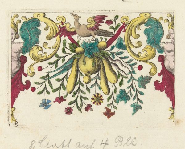 This print presents a garland between two mascarons, made by an anonymous artist. The mascarons, grotesque faces, are framed with foliage in the classical style. These motifs were prominent during the Renaissance and Baroque periods. Observe how similar masks appear across various epochs, from ancient Roman architecture to the prows of ships, warding off evil. The garland, a symbol of celebration, echoes through time, adorning victors and marking sacred spaces. Consider the emotional resonance of these faces; the masks, seemingly frozen in expression, evoke a deep, perhaps subconscious, connection to our ancestors. These symbols have a cyclical journey, reappearing in new guises, their essence reformed by the passage of time and the collective psyche of humanity.