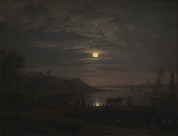 Editor: So, this is Corot’s "Le lac; effet de nuit" from around 1869, created using oil paint. The painting is predominantly dark, depicting a nocturnal scene with a lake, a small boat, and a glowing moon. What jumps out to me is how the textures were created, with thick applications of paint creating light. How do you see this piece? Curator: I find it striking how Corot uses oil paint here to mimic the ethereal qualities of night. It's crucial to remember that "Romanticism," the listed style, had strong ties to industrial changes; the sublime nature was directly contrasted with expanding capitalist ventures. How does this contrast manifest itself materially in Corot's brushstrokes and handling of light? Is there a dialogue happening between artistic vision and the increasing demands of art production and distribution? Editor: That's fascinating! I hadn't considered the production side of art within the piece itself, I was really focused on my aesthetic reaction. Curator: Think about the labor involved, the accessibility of materials in the late 1860s. Oil paint, although more common, still had costs associated with it – who had access to these means of artistic expression, and how did this influence the subject and style they adopted? Did Corot sell his paintings for display or did they mostly belong to the subjects that he captured in his paintings? Editor: That gives me a totally different angle on this painting. I had this feeling of solitude when viewing the artwork initially. Now, when viewing the same artwork, I am aware of all of these different factors related to social aspects. Curator: Indeed! Understanding the means of production and the societal influences opens new doors for interpreting artwork. The darkness here might speak volumes, not just aesthetically, but also materially and socially. Editor: Absolutely. This approach has given me a richer appreciation for how societal forces can really shape art beyond its surface appearance. Thanks!