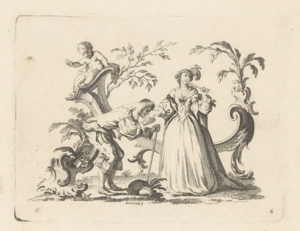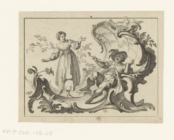 Cornelius Heinrich Hemerich created this print of a man smoking and drinking beer, but the image is more than just a representation of everyday life. Note the elaborate, almost theatrical setting. These ornamental flourishes, these swirling, organic forms, are not merely decorative. They are visual devices intended to evoke deeper, emotional responses. The man’s casual posture and the woman’s gestures seem to borrow from the Commedia dell'arte—a theatrical tradition that employed stock characters and archetypal scenarios. Like figures on a stage, they tap into a collective, shared cultural memory. Consider how such imagery recurs throughout history. Think of the bacchanals of the Roman era, or even earlier Dionysian rituals. There’s a cyclical pattern, a constant return to these themes of revelry and release. This image, in essence, invites us to contemplate not only what we see, but how deeply ingrained these symbols are within our shared human experience. It is a reminder that art is not created in a vacuum, but rather, it is a dialogue between the past and the present.
