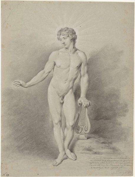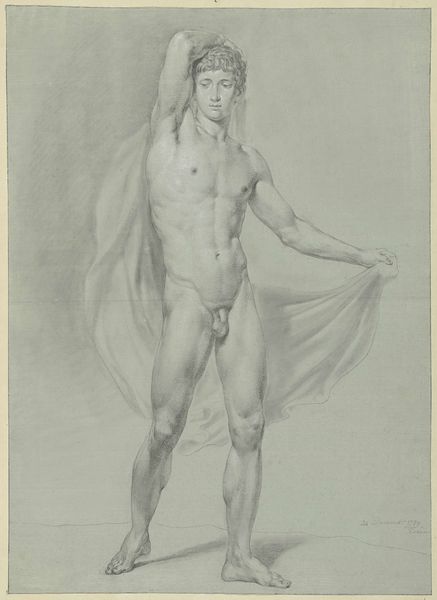 Jean Grandjean rendered this standing male nude with a cloth behind his back in the late 18th century. The figure's pose is rooted in classical antiquity, echoing the contrapposto stance favored by Greek sculptors, where weight is shifted to one leg, creating a balanced and dynamic form. The cloth draped behind him carries symbolic weight, reminiscent of ancient statues of gods and heroes. This motif has morphed over time, appearing in Renaissance paintings as a symbol of status or divinity, and in Baroque art to evoke drama and theatricality. Like a long thread, the cloth connects the past and the present. The emotional resonance of this image lies in its evocation of vulnerability and strength. The male nude has long been used to express ideals of beauty and heroism, but it also reveals the subject's humanity. The enduring appeal of this image resides in its capacity to speak to our collective memory. Its recurring reappearance reflects our ongoing fascination with the body and its symbolic potential.