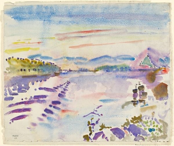 John Marin made this watercolor painting, Hudson River near Alpine, using paper and brushstrokes that feel like pure feeling. The way he’s put down these washes, layering blues and purples, it’s like he’s trying to catch the light shimmering off the water, or the mist hanging over the cliffs. He’s not trying to copy what he sees, but to translate it, you know? Look how the paint bleeds and blossoms. You can almost feel the dampness in the air. There's one little pink stroke right at the top, could be a cloud, could be the sun. It just sits there, this little dab of warmth against all the cool blues, and it makes the whole thing sing. It's so simple, but so effective. Marin reminds me of Marsden Hartley, in the way he uses these elemental landscapes to get at something deeper, something about the soul. He's not trying to give you answers, just opening up a space for you to feel.