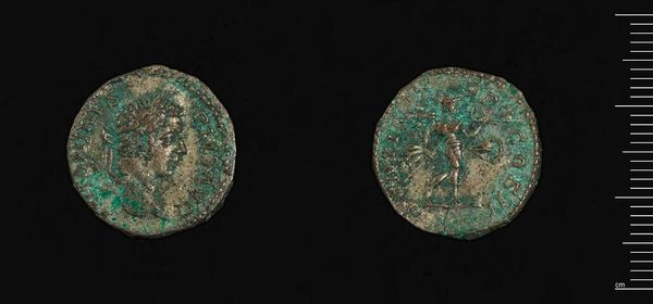 Curator: Look at this Sestertius, a bronze coin of Lucius Verus from the Harvard Art Museums. There's something incredibly haunting about the decay of the material, isn't there? Editor: Absolutely. I see the figure of Lucius Verus and what appears to be a goddess on the reverse, perhaps Pax, radiating an almost ghostly peace. Curator: It's fascinating how a single object embodies so much about Roman imperial power and economic production, its value intrinsically tied to the labor extracted to mine the metal. Editor: And each emperor used these emblems to communicate power and ideal virtues. Pax here symbolized stability and divine favor during Verus's reign. Curator: Even the coin's wear tells a story, revealing constant circulation and handling, a direct link to Roman daily life and trade networks. Editor: It's a tiny window into a vast empire, where symbols and power were intertwined. Curator: A fascinating relic, indeed. Editor: It certainly makes you think about what we value.