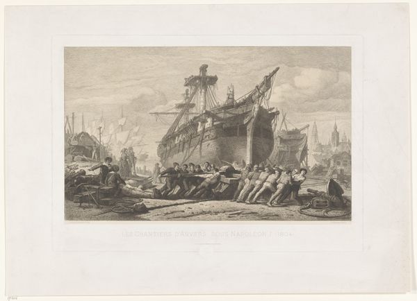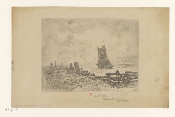 This etching by Félix Hilaire Buhot captures a somber sea view with a ship. The vessel, cutting through turbulent waters, suggests themes of travel and trade, but also the potential for isolation and peril. Consider the enduring symbol of the ship. From ancient Egyptian funerary boats to Viking longships, it has represented journeys between worlds. It appears in the mythical voyage of Jason and the Argonauts, and later in Romantic paintings, where nature reflects the sublime power of the cosmos. This maritime motif evolves, sometimes representing the soul's passage or the individual’s quest for meaning amidst life's tempests. Buhot's ship, however, evokes a melancholy mood. It whispers of human vulnerability, stirring our deepest fears and desires. The Romantic era often used similar iconography to convey intense emotional states, linking us to primal, almost subconscious responses. The ship, a vessel of hope and despair, continues its cyclical journey through art, literature, and our collective psyche, ever-changing yet eternally resonant.