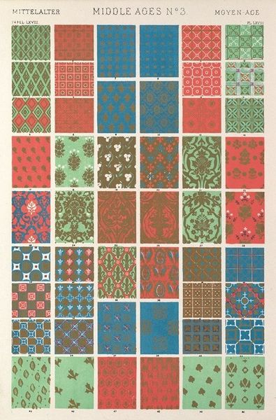 Editor: This is “Persian No.1”, a print from 1856 by Owen Jones showcasing various patterns, presumably intended for textile or decorative arts. I’m struck by the sheer variety of geometric and floral motifs he’s packed onto a single sheet. What's your read on this visual compendium? Curator: Its charm lies precisely in that structured accumulation. Note the grid; it acts as a frame, highlighting each pattern’s intrinsic qualities. The interplay of color—the reds, blues, greens, and yellows—contributes significantly. Are you drawn to any one in particular? Editor: I find the central square most appealing. The nested geometric forms create incredible depth and the symmetry is soothing. It stands apart from the more botanical-inspired designs around it. Curator: Exactly. Observe how its structure emphasizes a balanced, harmonious relationship of forms and colors, devoid of representational concerns. It's not about depicting something from the world, but about pure visual logic. Do you agree that, divorced from any external reference, the patterns take on lives of their own? Editor: I do! I see how the organization really underscores each pattern's unique structural composition. But it's interesting to consider their potential use in a real-world context – how that might change our understanding of them. Curator: Indeed. Context invariably shifts interpretation, but here, their essence lies within the visual experience. The relationship between the patterns themselves is enough. Editor: I never considered seeing pattern this way before – that an object could rely on the structure and relation of its parts as the ultimate meaning. Thanks for shedding light on that. Curator: A keen eye unlocks fresh perspectives, and pattern, however "simple" it may appear at first glance, is as richly visual as more evidently representational work.