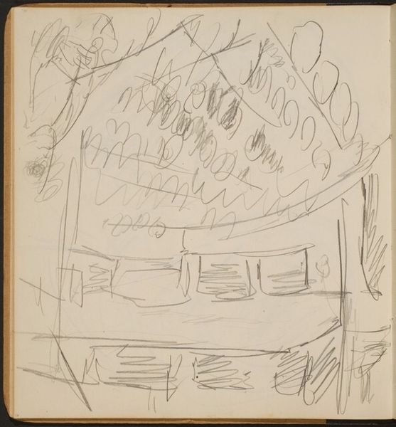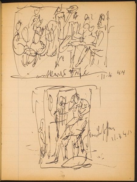 Editor: This is Max Beckmann's "Mann unter Wasser und Stilleben mit Kerzen (Man under Water and Still life with Candles)," from 1944 to 1949. It's an ink drawing. The composition, divided vertically, makes it seem like we’re seeing two different worlds. I'm struck by the contrast and the rather claustrophobic feeling, even in the "under water" scene. What jumps out to you as you look at it? Curator: The division of the page certainly presents an initial dichotomy. I see not so much separate worlds, but rather two contrasting arrangements of forms which underscore Beckmann's manipulation of spatial relations. Note how the dense hatching in the still life on the right contrasts with the relatively open, linear treatment of the underwater scene on the left. This is significant. Editor: Significant how? Curator: The visual weight created by the densely hatched marks pushes the still life forward, flattening the pictorial space. Conversely, the open lines and suggestion of receding planes in the left panel allow the eye to move deeper into the image, suggesting depth. Beckmann's disruption of conventional perspective creates a visual tension that activates the entire surface of the page. Editor: So it's less about what's being depicted, and more about how it's depicted, the line work and the creation of space. Curator: Precisely. We should be attentive to how line and form establish visual rhythms, activating the viewer's gaze as it navigates the spatial complexities he's laid out. It’s about the structural relationships between these two graphic systems. Editor: I hadn't considered how much the negative space contributes. Thanks for pointing that out. Now, the line work makes more sense as its own subject. Curator: It's these nuances that constitute the essence of formalist inquiry.