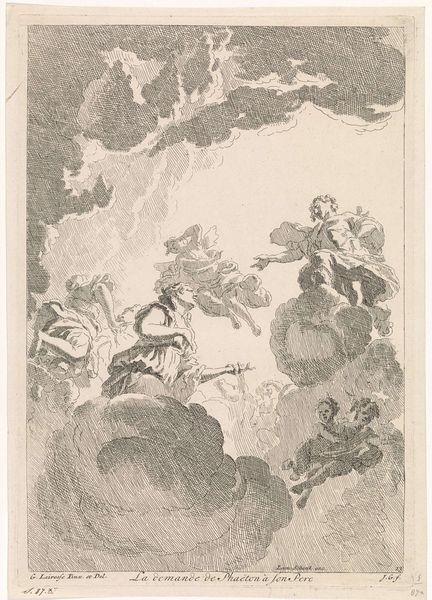 Curator: This work is entitled "Allegorie op het herstel van Willem V als stadhouder, 1787", or Allegory on the Restoration of William V as Stadtholder, 1787, from an anonymous artist. It resides in the Rijksmuseum. Editor: My initial reaction is that it’s a wonderfully busy, almost chaotic, watercolor. There’s a lot happening allegorically, but I’m particularly drawn to the muted green and neutral color palette that gives it an antique feel. Curator: Indeed. It depicts the political climate surrounding William V's reinstatement, showcasing the interplay of historical figures and symbolic elements to legitimize his restored authority. Looking closely, we see Willem V and an allegorical female figure, likely representing the Dutch Republic, standing triumphantly. Lightning strikes down on his foes while, to the left, other figures, perhaps representing Justice and Wisdom, look on. The visual vocabulary tells a clear story of restored power and divinely sanctioned rule. How does this representation speak to contemporary understandings of leadership and power? Editor: Considering today's socio-political lens, such overt glorification of power appears problematic. The very imagery, filled with classical allegories, signals an elite class reinforcing its position. A modern viewer may question whose interests are truly being served here, examining whether the promised "Overvloed en Vrede" will extend to all or only to a privileged few. And in whose narrative is justice really served? It compels us to dissect these historical representations for the ideological frameworks they promote and, perhaps, conceal. Curator: Precisely. By historicizing such images, we are better able to dismantle similar propagandistic efforts happening in our contemporary information landscape. It becomes imperative that art serves as an arena where those affected can actively decode these historical frameworks and formulate counter-narratives reflecting more inclusive accounts. Editor: Agreed. Investigating such artworks compels us to stay wary, analytical, and sensitive to the embedded messages within what appears as mere aesthetic imagery. It encourages vigilance, critical awareness, and intersectional thinking when we confront comparable images circulating today. Curator: I see this examination as critical to dismantling any structures seeking dominance. Editor: And I find this a great tool in which we equip audiences with enhanced socio-political observational capabilities.