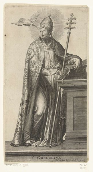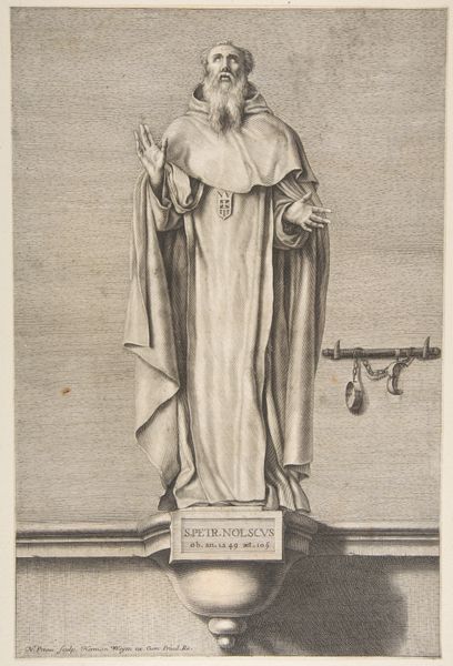 Editor: Here we have Nicolas Pitau's engraving, "The Blessed John Mata," dating sometime between 1620 and 1953. It’s currently at the Met. I’m immediately drawn to the quiet dignity of the figure. He stands so calmly, but there’s also a sense of… I don't know, restrained energy? What's your read on this one? Curator: Restrained energy… I like that. For me, it’s a study in contrasts. The meticulous detail of the engraving versus the smoothness and placidity, all contribute to a captivating tension. John Mata, known for ransoming Christians from slavery, holds those shackles – symbols of oppression, yet rendered with such delicate artistry. Feels kind of like staring into a complex mirror, doesn't it? What do you think those shackles represent beyond just the literal? Editor: Hmm, beyond the literal… maybe a challenge to see humanity in everyone, even captors? Or perhaps the chains we put on ourselves? Curator: Precisely! Pitau manages to portray not just a historical figure, but also a symbol. Notice the way Mata’s gaze avoids meeting ours. There's a humility there, an acknowledgement of something greater. He looks as if he could step right out of that pedestal. Does this pose bring something else to your mind? Editor: I see what you mean...like a statue brought to life! Curator: Yes, but with flaws, so more approachable! The artist used that static nature and a range of tones and shades to really convey emotion and the human aspect of his character. And with so much dark and light throughout the print... How would you tie it to what you know about Baroque sensibilities? Editor: The drama! Definitely a sense of drama, even in something so seemingly serene. And the high contrast feel brings a real gravitas. I initially thought of Baroque portraiture in painting, but I realize so much can be achieved even within the more restrained medium of engraving. Curator: Absolutely! It proves that even within constraints, true artistry flourishes, inviting us to reflect on freedom, compassion, and our own potential to break chains, literal or otherwise. I guess what stays with me is the power of a simple image to prompt complex feelings. Editor: Me too. And now I look at the figure, it feels less a posed saint and more a call to action!