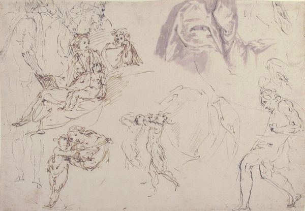 Curator: Here, we see Giovanni Domenico Tiepolo's pen and ink drawing, "Priam and Companions Outside the Walls of Troy," created sometime between 1770 and 1780. Editor: My first impression? It feels frantic, unfinished. Like catching a fleeting moment, full of restless energy but not quite grounded. The lines are so thin, almost trembling. Curator: Indeed, the very sparseness of the line directs our reading. Notice how Tiepolo uses hatching and cross-hatching to give depth and volume to the figures, despite the overall sketch-like quality. This deliberate use of line weight guides the viewer's eye. Editor: It's like he's capturing a memory fading at the edges. I find myself trying to fill in the blanks, imagine the story beyond those figures huddled together. They look so worried, or perhaps resigned? I keep wanting more detail though. It feels like a setup without a punchline! Curator: Well, that may derive from the Italian Renaissance style visible here. The composition uses relatively open form—but observe how strategically the main figures are grouped toward the center to draw the eye, while also opening outward into a space to infer a narrative. Editor: Ah, it certainly succeeds at being both emotionally intriguing while remaining visually aloof. This tension between expression and reserve actually amplifies the underlying mood for me, although this remains highly individual! Curator: Absolutely. While it may lack the immediate drama of a fully realized history painting, this ink drawing invites the viewer to participate in the storytelling process. By emphasizing compositional structure—the formal interplay of figures—Tiepolo creates a surprisingly accessible space for nuanced consideration. Editor: I can certainly say this feels different. So light yet laden... And I will surely ponder that contrast.