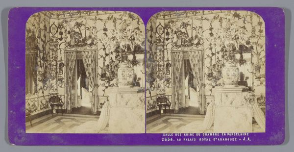 This stereoscopic image shows a salon in the Royal Palace of Madrid, and was created by Jean Andrieu in the mid-19th century, a time of political upheaval and social change in Spain. Andrieu's photograph provides a glimpse into the opulent world of the Spanish monarchy, but also invites us to consider the power dynamics inherent in such displays of wealth and privilege. What does it mean to create and consume images of such spaces, especially during a time of social inequality and political unrest? The photograph offers a fascinating insight into the representation of power, wealth, and social status in 19th-century Europe. As we gaze into this carefully curated scene, we might ask ourselves what stories it tells, and what stories it leaves unsaid.