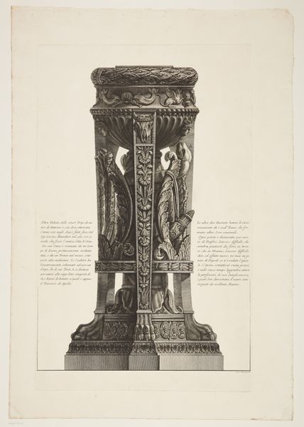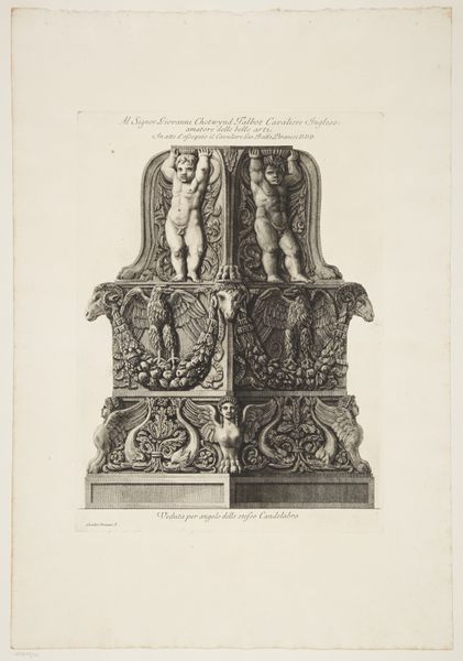 Giovanni Battista Piranesi created this etching of cinerary urns in the 18th century. These elaborate designs, with their trophies, arabesques, and flanking sculptures, are a testament to Piranesi's skill as a draftsman and his fascination with classical antiquity. Etching is an intaglio printmaking technique where the design is incised into a metal plate, traditionally copper. The plate is covered with a waxy ground, upon which the artist scratches an image with a pointed tool. The exposed metal is then bitten by immersing the plate in acid. The acid eats away at the lines, creating recessed areas that hold ink. In Piranesi’s time, the Grand Tour fueled a market for meticulously detailed prints like this, which served as both souvenirs and sources of inspiration for architects and designers. Through the repeatable medium of print, Piranesi democratized access to classical forms, disseminating them widely for study and adaptation. This print embodies the spirit of the Enlightenment, where knowledge and beauty were meant to be shared and celebrated.