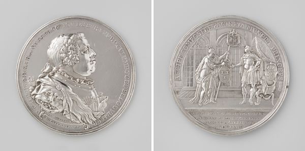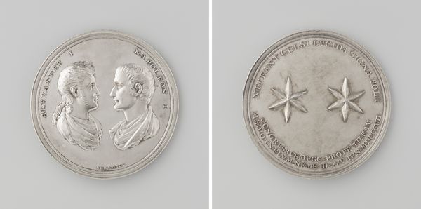 Curator: This is a bronze relief medallion from 1842 by Johannes Petrus Schouberg. It commemorates Jonkheer Johan Willem van Vredenburch and Jonkvrouwe Maria Adriana van Vredenburch. Editor: Immediately, the cold, hard nature of the material speaks to me of wealth, formality, and perhaps a desire for permanence. It seems like a rigid representation of status. Curator: It is indeed about memorialization and status, capturing the likenesses of this aristocratic couple in precise detail through the relief process. Note how the materiality emphasizes their presence. Editor: Absolutely. And consider the symbolic weight of the profile portraits themselves. From ancient coinage to official portraits, the profile has always represented authority, nobility, and the unflinching gaze of power. Their averted gazes give us no access. Curator: Good point! And speaking of access, I find it intriguing how bronze, a material traditionally associated with public monuments and heroic figures, is employed here on what appears to be a private, commemorative piece. Its mass production made commemorative objects more affordable for upper middle-class individuals and organizations. Editor: True. It seems a desire to emulate the elite and embed their own family within that lineage and visual language, though with this material, it’s like a miniature monument to their self-perception. Curator: Precisely. It brings us back to how objects shape and reflect social structures. Schouberg was astute in his ability to use this material to navigate those dynamics. Editor: So while it may initially strike us as a cold, detached representation, on closer examination, this medallion actually tells us a nuanced story about how individuals and families seek to assert their position through enduring materials and potent visual symbols. Curator: Agreed. Examining this artwork through the lens of materials and representation reveals a compelling snapshot of social aspirations. Editor: A worthy piece to ponder!