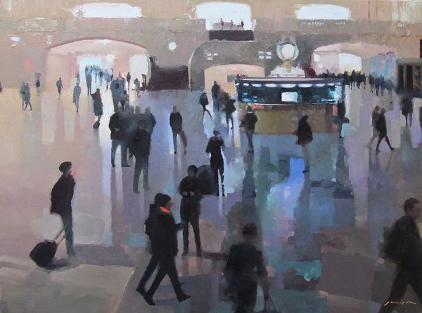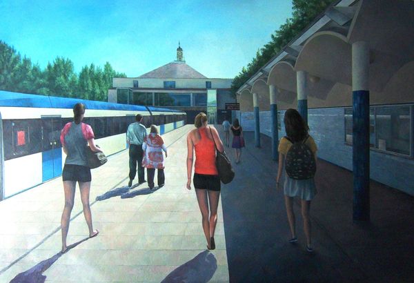 Editor: So, this is Consuelo Hernández's "Príncipe Pío Station" from 2010, painted in acrylic. There’s almost something Hopper-esque about the loneliness in this cityscape, but on a massive scale. What do you make of it? Curator: Well, immediately, the rigid lines and vastness bring to mind industrial cathedrals, spaces built for the movement of people, almost worshipful in their design but drained of any explicit religious symbolism. What stands out to me are the implied narratives – the posters, the passengers waiting. Do any of these elements speak to you specifically? Editor: I’m drawn to the lone figure looking at their phone. It seems like such a contemporary symbol. We are physically in this communal space, yet individually in another world. Curator: Precisely. The phone is the new prayer book. Note how it isolates her. And think about the red building above - a constant and perhaps even comforting structure contrasted to the fleeting interactions on the platform. Do you get the feeling that this building is an historical element in dialogue with the modern activity of the train station? Editor: Yes, absolutely. Like it's bearing witness to a constant cycle of arrivals and departures. Almost like the building provides a stable reference point in contrast with the ephemeral figures moving below it, plugged into another world, seemingly in transit through real space but anchored nowhere. Curator: So what do you take away from the image, now that you have spent a little time discussing the iconography of urban architecture? Editor: It really feels like a meditation on time and transition – the architecture embodying history while technology has collapsed time, so that the individual is alone, everywhere, all at once. Curator: Indeed, a potent statement about the contemporary experience using very traditional symbolic forms.