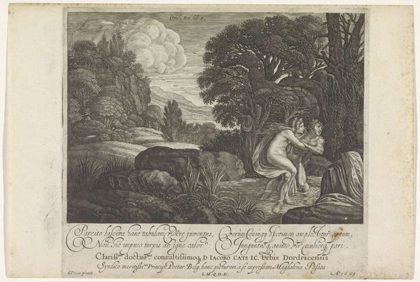Editor: Here we have Bernard Picart's engraving "Salmacis en Hermaphroditus" from 1708, housed in the Rijksmuseum. I’m immediately struck by the contrast between the serene landscape and the almost frantic embrace in the foreground. What should we make of that, historically? Curator: The scene depicts a moment from Ovid's *Metamorphoses*. Considering Picart's context, it is crucial to consider the socio-political role this print would have played. Remember, these images were circulating widely. The explicit portrayal of bodies, the very depiction of the gods, all served a purpose. How does Picart negotiate these elements in light of the era’s cultural norms, specifically those related to public imagery? Editor: So it's less about the emotional narrative and more about what its visibility signifies? The very act of illustrating such a story. Curator: Exactly. What did it mean to reproduce this tale? Note the strategic use of light and shadow to emphasize certain forms while obscuring others. It’s about power, access to classical knowledge, and the performance of status through visual culture. Editor: So, you’re saying the distribution of these images was also limited, perhaps confined to educated audiences. I guess it isn't really realism, despite how lifelike it looks? Curator: Precisely! The image's circulation would largely depend on those networks. What is particularly fascinating is thinking about who consumed images like these, how they were interpreted within their specific social context. Remember, every choice reflects the prevailing ideology, or potentially subtly critiques it. Editor: This engraving reveals more about 18th-century society and power dynamics than I initially thought. Thanks. Curator: The power of imagery resides not just in its beauty, but its ability to communicate unspoken codes of society. The real subjects are those implied social and cultural conventions.