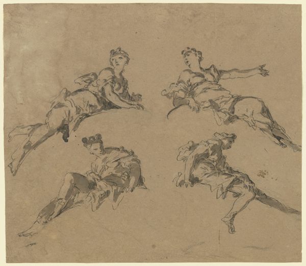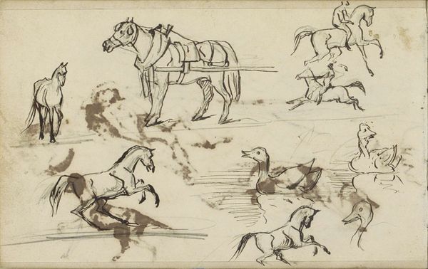 Curator: Géricault's "Sketches: Reclining Nude, a Horseman and Various Horses," dating from 1818-1819 and held at The Art Institute of Chicago, offers us a glimpse into the artist’s creative process through pencil and graphite on paper. Editor: My immediate impression is of restless energy, like capturing fleeting movements. The horses seem to burst off the page. What do you make of the clustered composition? Curator: It suggests Géricault was wrestling with classical themes. The horseman evokes centuries of equestrian portraiture, but the reclining nude above him—seemingly unrelated— hints at the psychological and symbolic undercurrents that define Romanticism. There is a palpable tension in their contrast. Editor: Yes, observe the musculature depicted with such precision. You see how Géricault masterfully renders form with simple, assured lines? It's a study of light and shadow achieved with incredible economy. The artist uses hatching and cross-hatching to suggest depth and volume with surprising complexity, while also producing many lines to illustrate the motion of the objects and humans in the sketches. Curator: The horse, a recurring symbol throughout art history, here seems untamed, reflecting a larger societal unease. The Romantic era saw artists questioning established orders, turning inward to explore intense emotional states. The horse can easily become a representation of unbridled passions of freedom and control that could either bring conquest or be the death of humans. Editor: The sketch-like quality almost dissolves the subject into pure dynamism. Consider the strategic use of negative space; how the empty areas around each figure contribute to a feeling of boundless possibility. This work lacks some level of polish but speaks to an attempt to understand or realize something in motion. Curator: Precisely! Géricault, in these preparatory sketches, isn’t just capturing figures; he's charting the volatile landscape of human emotion and historical change. Editor: Ultimately, it highlights the artist’s capacity to find grandeur even in the intimate space of a sketchbook, offering unique insight into art-making. Curator: I agree. It serves as a fascinating testament to his visual vocabulary, reflecting social turmoil of its time as well as an early Romantic sensibility.