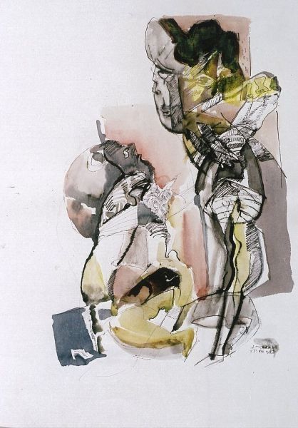 Editor: This is Patrick Procktor’s "Peter, Anguillara," a watercolor drawing from 1967. The washes of grey and single splash of blue feel really modern. What strikes you most about the piece? Curator: I'm immediately drawn to the stark contrast in technique. The figure is rendered with loose, almost gestural strokes, yet there's a surprising precision in the depiction of the blue shorts. Do you perceive how that tension impacts your reading of the image? Editor: It kind of isolates the shorts. I initially saw the pose as relaxed, maybe even vulnerable. But the hyper-detailed rendering of the shorts almost objectifies that area of the body, shifting the tone a little bit? Curator: Precisely. Consider the composition further: the cropping of the figure. What effect does that truncated form have? The face seems incomplete, almost abstract. Editor: That gives it a real immediacy, doesn’t it? The watercolor isn't trying to hide that it’s a study; Procktor focuses on form rather than realistic representation, which makes the blue all the more intriguing as a block of color. Curator: The color is applied almost independently of the structure of the legs. Does the stark contrast between form and formlessness play into that idea of isolation? Editor: Yeah, like the color becomes almost sculptural. I didn't notice that at first. Thanks for helping me look closer. Curator: Indeed. By focusing intently on the construction and chromatic relationships within the artwork, we arrive at insights that exceed surface appearances.