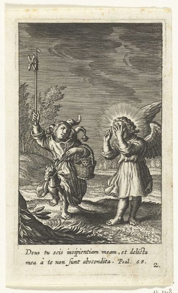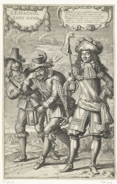Abraham Bosse created this print, "Two Marauders," using etching techniques. The composition directs our gaze to the foreground, where the figures of two young marauders are rendered with meticulous detail, their forms sharply defined against a softer, atmospheric background. Bosse masterfully employs line and texture to distinguish between the marauders' rough attire and the landscape they traverse. Look at the way the heavy lines define the folds of their garments, contrasting with the lighter, more delicate lines used to depict the distant buildings and sky. This contrast serves to emphasize the subjects' presence and their disconnection from the refined society hinted at in the background. The marauders embody a disruption of social order. Their detailed depiction challenges conventional aesthetic values and invites us to question the social structures that define beauty and worth. Bosse uses the formal elements of line and composition to create a visual commentary on the era's social landscape, challenging viewers to reconsider their understanding of value and morality.