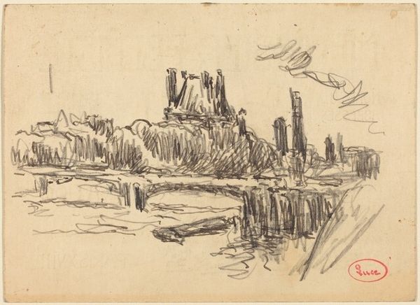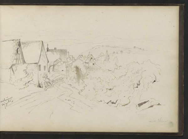 Curator: What a delightfully informal sketch. This is Jan van Goyen’s "Herberg met uithangbord," or "Inn with a Signboard," dating from around 1650. He executed it in pen and pencil, with a subtle mastery typical of the Dutch Golden Age. Editor: Immediately, the gestural quality strikes me. It’s a quick study, yet the artist manages to convey form and texture using remarkably few lines. The composition feels solid, grounded. Curator: The signboard itself acts as a significant cultural marker. Inns, in Van Goyen’s time, served not only as places of rest, but also as social hubs and meeting points for commerce. The signboard would have been readily identifiable by the travelers. Editor: Notice how Van Goyen uses hatching to build up the form of the building, creating a clear sense of light and shadow. He carefully articulates the rough textures, contrasting them with the more loosely drawn background. The very lack of detail invites a deeper consideration of the essence of the scene. Curator: And consider that the scene also suggests an idealized vision of rural life, echoing the communal spirit of the Dutch Republic, where prosperity relied on exchange. This image speaks volumes about social and cultural values of that era. The thatched roof, for example, can represent rustic charm but also temporality and decay. Editor: You’re right. But formal aspects really underscore that point. See the strong diagonal leading up to the inn from the bottom left corner and how it leads to the strong horizontal strokes in the thatched roof. Van Goyen has carefully laid it out to achieve that exact emotional note. Curator: Looking at "Inn with a Signboard" gives a direct connection to the people and values of 17th century Netherlands, the drawing carrying that memory to this day. Editor: Absolutely. Van Goyen's deceptively simple sketch is more than just a picture; it’s a record of his own engagement with the scene, rendered visible by his compositional decisions and skillful handling of line.
