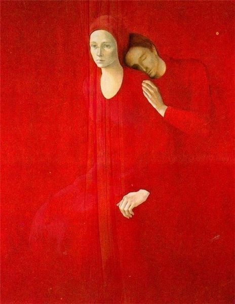 This compelling, untitled image is by the Catalan artist Montserrat Gudiol. It speaks to us from a time when women artists were often underrepresented, yet managed to carve out spaces for their unique visions. The woman’s intense red clothing against the dark background evokes both passion and introspection. Her head is bowed, which suggests a moment of contemplation or perhaps weariness. Given Gudiol’s background in a deeply religious family and her experiences during the difficult years of post-Civil War Spain, one can imagine that this painting might explore themes of inner strength and quiet resilience. While the red might symbolize the traditional associations of womanhood with love, Gudiol seems to develop this narrative by adding depth and complexity through the figure's introspective pose and the almost severe simplicity of form. This portrait reflects the emotional and personal dimensions of navigating a world where women's voices were often muted.