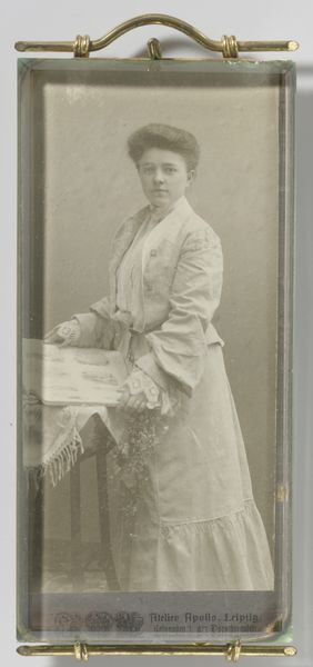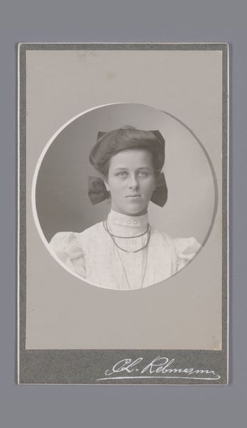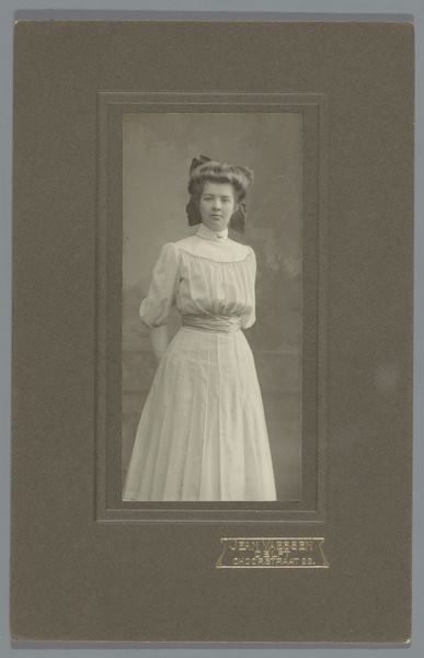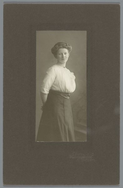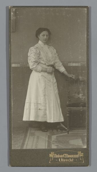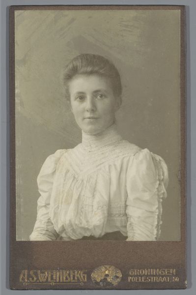 This photographic portrait of an unknown woman was produced by Jean Vaessen in Delft. It’s a tightly framed, tonal image, verging on monochrome; the soft sepia palette suggesting a gentle bygone era. Photographs are so interesting, aren’t they? They claim to capture a definitive moment, yet they're always open to interpretation. The woman’s dress is fascinating, you can almost feel the cotton and lace. Her posture is poised, with her hands clasped behind her back, yet her expression is somewhat inscrutable, which adds a sense of mystery. The background, an almost indistinct grey, gives the portrait a timeless quality. You could easily imagine her as a character in a novel or a figure in a dream. Consider how the image relates to the history of portraiture, perhaps drawing inspiration from painters such as Whistler or Sargent in its delicate tonality and ambiguous mood? Ultimately, it remains an open question, inviting us to project our own feelings and narratives onto her image.