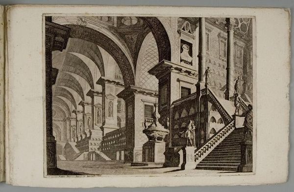 Editor: This is "Memberships of ancient baths with stairs leading to the Gymnasium and the Theatre," an etching by Giovanni Battista Piranesi. It's incredibly detailed, almost overwhelming, and the perspective feels a little distorted, in a way that's both impressive and unsettling. What strikes you when you look at it? Curator: Oh, Piranesi! He's like the M.C. Escher of the 18th century, but with more ruins and a flair for the dramatic. What grabs me is how he conjures up this dream-like vision of antiquity. It’s not a document of what was, but a potent, theatrical reimagining. Almost like a stage set, wouldn’t you say? And it plays on our perceptions... where are we, really, within this sprawling complex? Are we looking *at* something or *into* something? Editor: That's a good point – it definitely feels like a set. A set for a play that never happens. I guess that distortion adds to that dreamlike quality. It feels very artificial. Curator: Precisely! And consider the period. This was during the Grand Tour era when wealthy Europeans were traipsing around Italy “discovering” its classical past. Piranesi wasn’t just showing them the sights; he was selling them a feeling, an atmosphere thick with romantic melancholy. He captured their imagination and made them feel as though they understood antiquity better than they actually did. It’s quite cunning, really. Almost selling snake oil for the soul! Do you think his interpretation does an injustice to actual history? Editor: That’s an interesting angle! I'm not sure "injustice" is the right word... maybe "romancing the truth" for the sake of beauty. It certainly adds another layer to think about, beyond just the visual impact. I never thought of this print as being cynical, though. Curator: Oh, not cynical at all! Just very knowing. Editor: I’m seeing this print in a whole new light, especially knowing it speaks of truth and manipulation. It definitely won't look the same next time. Thanks!