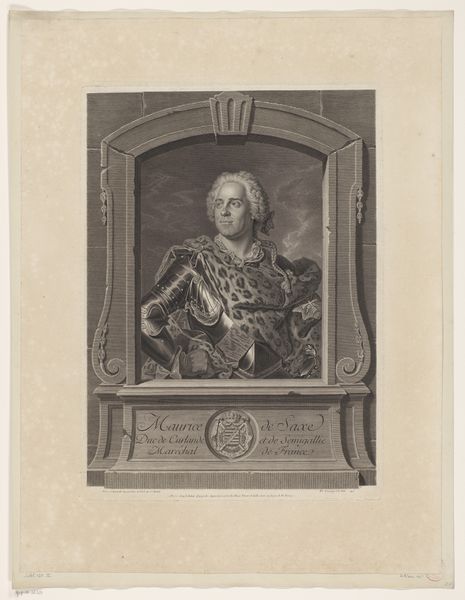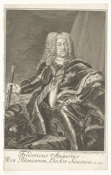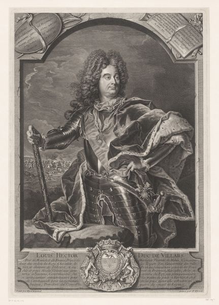 Curator: This is Georg Friedrich Schmidt's portrait of Pierre Mignard. It's striking how Mignard is presented: perched at the intersection of artistic mastery and royal authority. What do you see in this representation of power? Editor: It feels very staged, almost performative, with the flowing wig and the poised hand holding the pen. Is this performativity itself a form of power? Curator: Exactly. Schmidt isn't just depicting Mignard; he's constructing an image of artistic genius intertwined with societal status. Think about the French court, the systems of patronage, and how identity was crafted through representation. Editor: So the portrait is not just about Mignard, but the social and political structures that gave him power? I hadn't considered that. Curator: Precisely. It makes you wonder about who gets to be remembered, and how. Editor: This definitely makes me rethink portraiture's role beyond mere representation. Thanks!