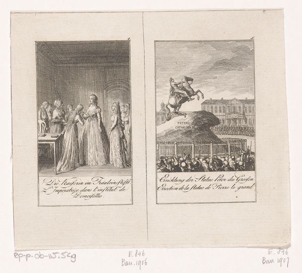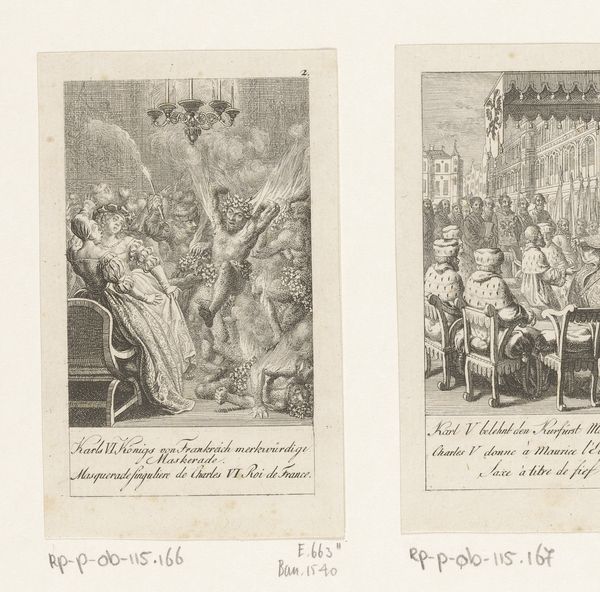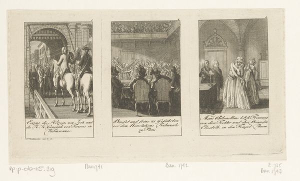 Editor: So, this engraving is "Frederik III crowning himself," made by Daniel Nikolaus Chodowiecki in 1791. It seems like such a formal, almost staged moment, and yet, there’s something slightly absurd about a king crowning himself. What do you make of it? Curator: Ah, yes, a king crowning himself! It's dripping with the *theatricality* of power, isn't it? Chodowiecki captured not just the historical moment, but the self-conscious *performance* of sovereignty. I wonder if, on some level, he was also suggesting the fragile nature of power—how it depends on *perception*, on creating a convincing image for the audience. Can you almost sense the tightrope he is on, carefully placing that crown. It is like an internal journey… the moment when the artist meets… I don’t know… divinity. It almost feels spiritual. Editor: Fragile? In a piece about a king's coronation? I see the pageantry, but fragile is not a word that springs to mind! Curator: But think of the context! The Baroque style loves its drama, yes, but also, consider the era. Power struggles, shifting alliances… This print was made almost a century after the event itself! Do you not imagine the *distance* in Chodowiecki’s artistic memory and historical commentary? Does that perspective change your view a little? Editor: Hmm, interesting point. So, it's not just a record, it's also an interpretation *with hindsight*. I guess I see a new layer now, thanks. I wonder, what the King himself would have thought! Curator: Ah, if only portraits could talk!