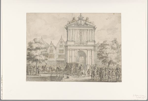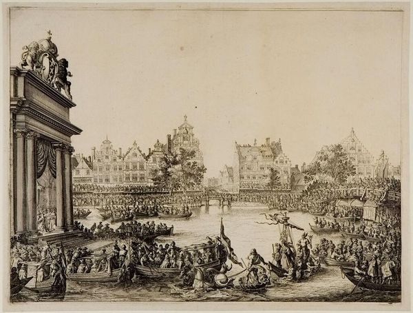 Editor: This is Salomon Savery's "Procession on the Oudezijds Voorburgwal Before a Triumphal Arch at Center." It's an etching, and it feels very much like a document of its time. What social dynamics do you think are at play here? Curator: The triumphal arch, especially in a Republic, always begs the question: triumph over whom, and for whose benefit? Who is being celebrated, and whose labor built that arch, both literally and figuratively? Consider the power dynamics inherent in displays of public spectacle, and who is included or excluded from them. Editor: That's interesting. I hadn't considered the implications of the arch in a Republic. Curator: Exactly. What stories are being told, and whose stories are being silenced or erased by such grand narratives? Think about the accessibility of power versus the representation of power. Editor: Thank you for pointing out the importance of questioning celebratory displays. It makes me consider the subtle power dynamics in what seems like a simple depiction of a parade. Curator: Precisely. By examining these historical representations, we can better understand how power operates in our own time.