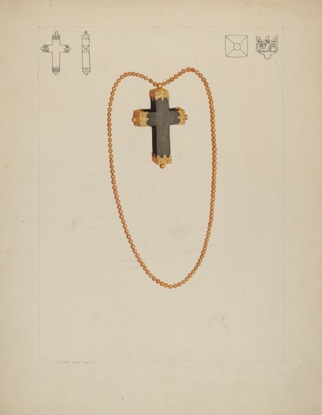 Curator: We’re looking at a watercolor and ink drawing from around 1937 entitled “Cross and Chain.” The image features, quite literally, a cross pendant hanging from a chain. Editor: It strikes me as incredibly austere, almost solemn. The contrast of the dark cross against that pale, barely-there background evokes a sense of isolation. The meticulously rendered chain, though...that gives me a feeling of entrapment. Curator: Entrapment? Tell me more. Editor: The cross itself is rigidly geometric, the gold embellishments offering very little softness. The gold chain, precisely looped, is beautifully rendered...but that repetition makes me restless. I immediately start thinking of rosaries, a feeling of constrained spirituality. Curator: It’s interesting you picked up on that feeling, considering the work's style employs stark linearity which echoes earlier artistic movements like precisionism and some of the diagrammatic works that came out of the Bauhaus school. Editor: Linearity, absolutely. The crisp edges almost seem mechanically rendered, a stark contrast to the watercolor, which you expect would soften it. And there's so much empty space on the page. A lot of religious art makes heavy use of decorative ornament; the sparseness here denies us that opulence. Curator: Indeed. The artist seems to be using familiar imagery while pushing into an abstracted sensibility. Consider that even the shadows on the cross are delineated with these clear, dark strokes, reducing any illusionistic tendencies. Editor: It does, doesn't it? And I keep returning to the gold against that deep charcoal, like glimmers of hope amidst despair. Curator: The work almost acts as a symbolic meditation of sorts; it offers familiar images, yet its stylistic treatment provides the artwork a uniquely unsettling emotional presence. Editor: Absolutely, you can feel that tension held on the page between faith and...is it doubt, perhaps? Regardless, this piece manages to ask a question without answering. That in itself feels pretty profound.