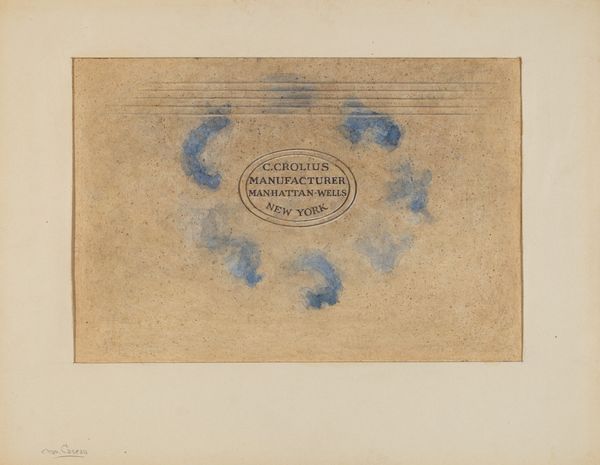 Curator: Looking at this artwork, a 1936 watercolor and drawing on paper by Charles Caseau titled “Jar”, what strikes you first? Editor: Well, it's rather intriguing. The limited color palette – mostly earth tones and blues – gives it an aged, almost antique feel. The composition is strange, an incomplete emblem of sorts centered within what appears to be some kind of old packaging or advertisement. Curator: Precisely. Caseau's drawing gives us a glimpse into the world of early 20th century commercial art, focusing on the branding for C. Crolius, a stoneware manufacturer in Manhattan Wells, New York. These drawings, created as potential branding, reflect the visual language of their time, using specific visual cues to communicate an image. Editor: Visually, the arrangement is off-kilter. The oval containing the manufacturer's name feels separate from the swirling blue forms beneath. Is it a reflection of water, given their "wells" location? The texture within the brown fields feels gritty, much like the ceramic the firm specialized in producing. There’s also a visible interplay between the controlled lettering and these organic blue patterns. Curator: That contrast you’re picking up on shows a blending of modern artistic principles with practical design. Businesses needed an image, and modernist style was entering graphic design to influence popular thought in marketing. Editor: Do you think its aesthetic success lies more in its functional purpose than as a standalone work of art? Is it art only by being shown in this gallery? Curator: In its original context, it was pure utility. Now, presented here, we reflect on how these materials offer insight into our historical sense of beauty, branding and culture. What began as merely utilitarian becomes a record of commercial and visual strategies. Editor: True. I appreciate how studying such a seemingly minor piece can unlock broader understandings about artistic values, marketing, and cultural identity across time. Curator: Exactly. It’s a tangible link to the history of consumerism, artistic movements, and marketing itself!