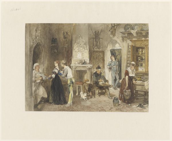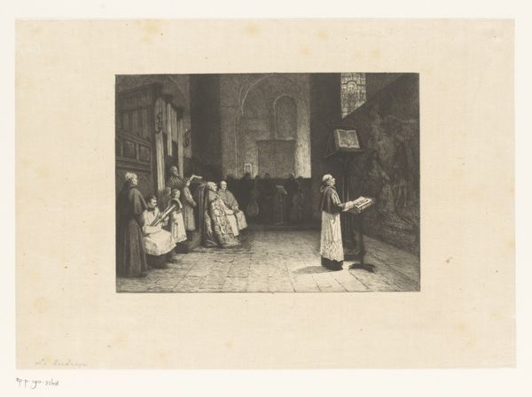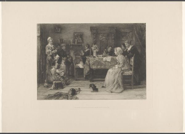 Carl Ernst Forberg created this artwork, "Young Woman with a Lawyer," using etching techniques. The composition invites us into a scene dominated by contrasting emotions and social hierarchies. The visual elements like the stark chiaroscuro, where light and shadow define the characters’ emotional states, set the somber tone. The structure is divided into a left quadrant with older lawyers absorbed in documents and to the right a downcast young woman sitting at a table. Forberg uses formal elements to create a dialogue between the old and new. Notice how the texture of the etched lines and the use of shading add depth, emphasizing the weight of tradition and the burden it places on the young woman. The formal presentation raises questions about power, gender, and societal expectations. This is not just an image of a historical scene; it is a careful construction that challenges us to decode the visual language. This etching continues to speak to our understanding of representation and the nuanced ways in which art engages with cultural dialogues.