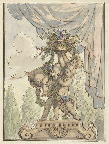 Editor: So, this is Nicholas Zupa's "Parlor Flower Stand," created around 1939. It looks like it's made with colored pencil and watercolor on toned paper. I’m struck by how delicate and intricate it is – it almost feels like a faded memory. What do you see in this piece, particularly considering it was made on the eve of World War II? Curator: Well, it immediately makes me think about the symbolic language of flowers, and how meticulously Zupa has depicted this constructed floral arrangement. It reads like an emblem – almost a coat-of-arms – for domestic tranquility. Notice the fragile balance, the striving upwards, yet it's all contained, carefully managed. Considering the impending global conflict, could this be read as a yearning for an idealized, perhaps increasingly unattainable, home life? The flowers, so deliberately chosen, each carry their own weight: roses for love, perhaps lilies for purity. Does it feel at all like a wish, carefully rendered in pencil and watercolour? Editor: That’s a really interesting point, especially the idea of the coat-of-arms. It also makes me wonder about the placement of the flower stand – in the ‘parlor.’ The parlor, I understand, functioned as the public space for receiving and relating. Curator: Exactly. It would have been the showcase room, laden with meaning and aspirations. The objects, carefully chosen and arranged, sent signals. Zupa, here, seems to be almost meticulously recording that symbolic arrangement, as if documenting a vanishing world. But does it feel…authentic? Or somehow contrived? Editor: I see what you mean. It does feel slightly artificial. It’s beautiful, but also a little stiff, almost as if the flowers are pinned in place. Curator: And isn't that fascinating? The tension between the natural and the constructed, the beautiful and the slightly unsettling. It’s in this tension that the artwork reveals its depths and provokes us to think more deeply about it, even today. Editor: That’s true, I never considered it in such detail before. It’s fascinating how much a seemingly simple drawing of flowers can convey about a specific moment in time. Thanks so much! Curator: My pleasure, thinking through this visual language really shows that there is always so much to decode in visual media, even in simple floral sketches!