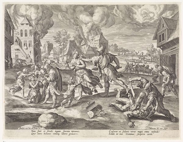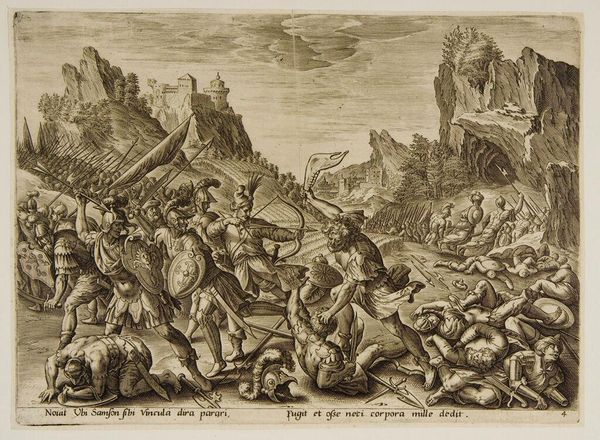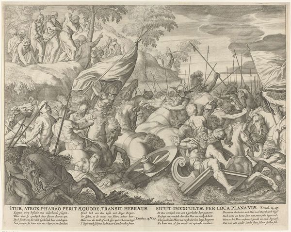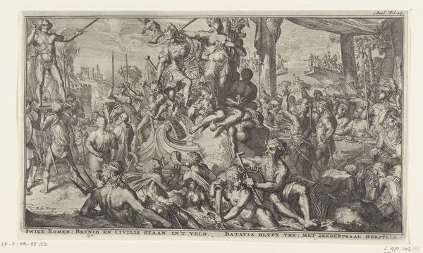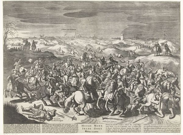 Editor: Here we have Pieter Pickaert’s engraving, “The Irish Defeated at Enniskillen, 1689,” created in 1691. The scene is chaotic, a swirling battle filled with smoke and fallen figures. It’s incredibly detailed for a print. What's your take on this, particularly considering the subject matter? Curator: This print, though seemingly a straightforward depiction of a battle, demands a deeper interrogation. It’s not just about who won or lost, but about how power dynamics are visually constructed and reinforced. The victorious “garrison of Inniskilling” isn’t a neutral term; it’s loaded with the history of colonization and religious conflict in Ireland. Editor: So, you’re saying it’s more than just a historical record? Curator: Precisely. Consider who commissioned this work, who the intended audience was. The artist made a very specific choice of subject to highlight, with significant choices around who is rendered with greater clarity. Editor: I see the perspective, how history can be twisted to push an agenda... Curator: Think about it: why immortalize this particular event in this manner? It serves as propaganda, celebrating a victory that solidifies the dominance of one group over another. Editor: Right, the narrative around these conflicts often simplifies complex realities. Curator: Exactly! We must ask ourselves how visual representations like this contribute to a collective memory, often erasing or marginalizing the perspectives of those who were defeated. How can we see the victims, not only victors? Editor: This makes me look at it from an entirely different angle, beyond the simple victory scene. I see what the choices mean. Curator: Understanding these power dynamics in art can give insights into broader issues of social injustice, making us all the more critical viewers. Editor: Thank you. This engraving has more layers to unpack than I first assumed!