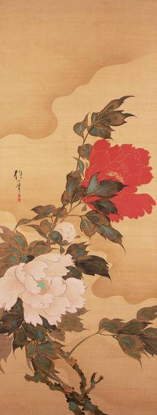 Editor: This is "Rooster and Family" by Ito Jakuchu, created in 1797. It's an ink on paper hanging scroll, so a painting but also almost like a textile with the way it’s mounted. There's something so domestic and serene about this rooster protecting his little chicks, all surrounded by these lush peonies. What strikes you most about it? Curator: Ah, Jakuchu. A delightful explosion of controlled chaos, isn't he? I love that "domestic and serene" is your first reaction because, honestly, that’s what *I* tell my relatives when they ask about my lifestyle. Serene. *Totally* serene. But, more seriously, look closely. Does the rooster look entirely benevolent? Notice the intensity in his gaze, the tension in his claws. It's like he's daring the world to even *think* about messing with his family. Editor: Hmm, I see what you mean. There's a possessiveness there. A protective rage, maybe? Almost like a samurai, but...a rooster? Curator: Precisely! Now you're cooking with rooster fat! Think about Japanese society at that time—highly structured, samurai code ever-present. Jakuchu cleverly inserts that spirit into, of all things, barnyard fowl. And the peonies! They're symbols of wealth and status. So, is he making a commentary on class, protection, or maybe the illusion of serenity we construct around ourselves? It's all there, layered within the exquisite brushstrokes. Editor: So, it's much more than just a pretty picture of some chickens! It's got these little subversive elements woven in. I was just admiring the cute family portrait. Curator: And it *is* beautiful! Never forget the beauty! Jakuchu understood that sometimes, the most profound statements are hidden inside the most pleasing packages. Never judge a book, or a rooster, by its cover. Editor: Definitely a different way of looking at it! I appreciate learning more about how the context elevates the viewing experience. Curator: Anytime, this was a clucking great experience.