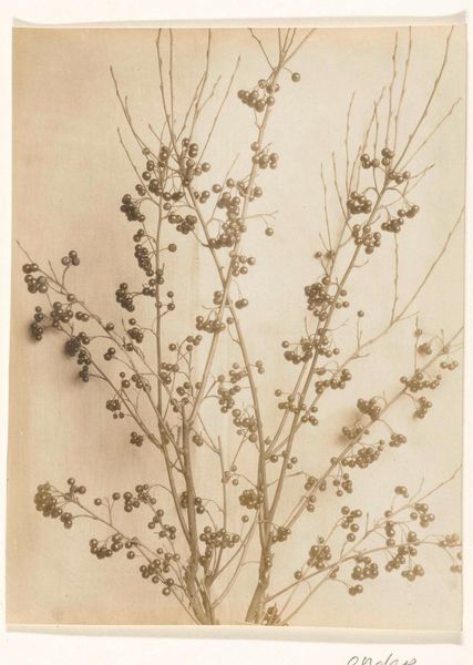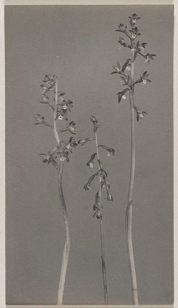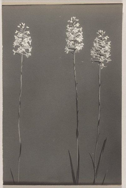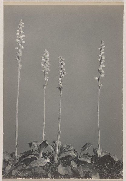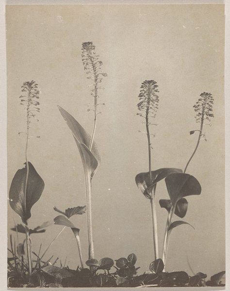 Edwin Hale Lincoln produced this photogravure print, "Corallorrhiza trifida- Early Coral Root," with great precision. The subdued monochromatic palette and the almost clinical sharpness of the photographic medium invite a focused, unemotional contemplation. Lincoln’s composition arranges three distinct botanical specimens against a neutral backdrop, each differentiated by form and texture. On the left, the fern exhibits a complex, feathery structure, contrasting with the smooth, elongated stems of the two coral root plants to the right. This juxtaposition establishes a visual rhythm that moves from intricate to simple, rough to smooth, drawing the eye across the frame. The stark presentation and meticulous arrangement suggest an interest in scientific cataloging. However, the carefully calibrated balance and stark aesthetic also evoke a deeper engagement with the formal possibilities of photography. Lincoln seems less concerned with the natural, untamed aspects of his subjects and more with the potential for capturing and ordering the natural world through the lens of photographic technology. This work is not simply a record but an aesthetic and intellectual exercise.