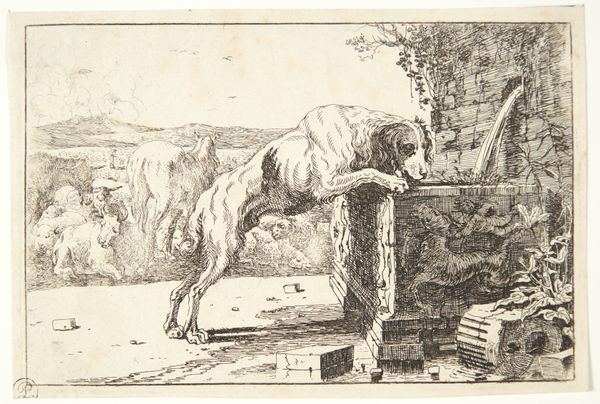 Editor: So, here we have Simon de Vlieger's "Waakhond," created sometime between 1610 and 1653. It's a drawing, etching, or print of a very relaxed-looking guard dog. I find it striking how detailed the rendering is, given it's "just" a sketch. What catches your eye about it? Curator: For me, it's the stark contrast between the relatively quick execution of the lines and the weighty subject matter of labor. Think about the material realities represented: the dog, literally chained to its post; the humble wooden structure it guards. Editor: The labor is embedded in both the subject and artistic representation, yes? How does this challenge traditional views of art versus craft? Curator: Precisely! In Vlieger's time, these drawings were not prized commodities. They served more as a raw material in his artistic production—studies for larger, more 'valuable' works, or as tradeable commodities themselves. Editor: Like preliminary studies, raw material of an economic trade, perhaps? Is that how it challenges the boundaries? Curator: Exactly. It prompts us to consider the role of the "lesser" drawing, and how our modern perception of its status contrasts the artistic creation in that context. Even the act of creating this sketch – the cost of materials, the artist’s labor - carries significant material implications. We tend to focus on the artistic genius, and gloss over the means of making. Editor: That's so interesting. I guess I never thought of sketches as existing in a similar context to labor initially! Curator: The sketch contains material and social history that asks, how was art treated as product at the time? Now that you’ve contemplated the relationship of dog as labor to art as labor, what did you find most striking about this piece? Editor: The economic tension is amazing! Seeing both art and labor depicted shifts the value so the scene depicts more than meets the eye. Thank you!