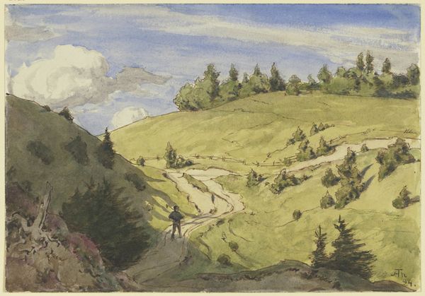 Hans Thoma's landscape drawing invites us into a world rendered in delicate watercolor washes and precise pencil lines. The composition, a cascade of hills receding into a mountainous backdrop, evokes a sense of serene depth. Thoma employs a limited palette of greens, blues, and browns, creating a harmonious balance that softly guides the eye through the landscape. The meandering paths and subtle gradations of tone give the scene a dreamlike quality. Note how the textures shift between the smooth, blended washes of the sky and the sharply defined foliage. The use of line creates subtle shadows, shaping the form of the hills. This piece reflects the artist's interest in capturing the emotional resonance of nature. The landscape transcends a mere depiction of scenery, inviting us to contemplate the relationship between the individual and the natural world. Its quietness is its power.