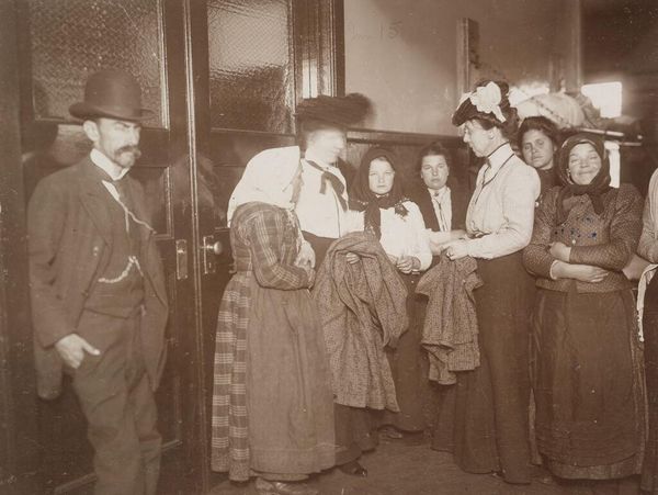 Editor: This photograph by J.H. Adams depicts a group of immigrants awaiting deportation at the New York City immigrant station. It’s a very stark image, filled with weariness. What does this photograph tell us about the immigrant experience? Curator: This image lays bare the brutal realities of immigration policies. It prompts us to consider who is deemed "desirable" and who is excluded. How does the composition, the way these individuals are grouped together, speak to the lack of agency these people had in their own lives? Editor: It feels dehumanizing. They're huddled together, almost like cargo. Curator: Exactly. It forces us to confront the historical and ongoing power imbalances inherent in immigration systems and reflect on whose stories are often erased or ignored. Editor: I hadn’t thought about it that way. Curator: Consider the gaze of each individual. What can we learn from where they are looking – or not looking? Editor: It’s a hard photo to look at, but important to see.
