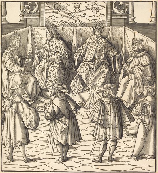 This illustration from *The White King*, was created by Hans Burgkmair using a woodcut technique. It’s a relief printmaking process where the artist carves an image into the surface of a block of wood, leaving the printing parts level with the surface while removing the non-printing parts. Look closely, and you’ll see an incredible amount of detail achieved through the careful control of the cutting tool. The varying line weights and cross-hatching create a sense of depth and volume. Burgkmair would have needed immense skill and patience to render such detail on woodblock, cutting along the grain to achieve the desired effects. The texture of the wood itself would have influenced the final print. The labor-intensive nature of woodcut printing speaks to the value placed on craftsmanship during the 16th century. Note the way in which these issues of labour and production are literally foregrounded in the image. The king and his court are quite literally standing on the results of someone else’s work. This element of skilled handwork adds another layer of meaning to the artwork, offering a glimpse into the social and economic dynamics of its time.