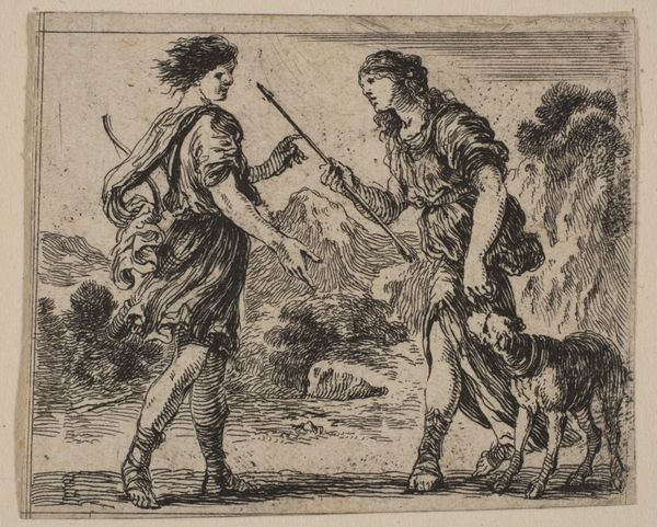 Curator: Here we have Stefano della Bella's etching, "Apollon et Daphné," likely created sometime in the 17th century. It's part of the Minneapolis Institute of Art's collection. Editor: It's certainly dramatic! The sense of movement is palpable, almost frantic. The starkness of the etching style really amplifies the tension between the figures. Curator: Della Bella, working within a Baroque aesthetic, employs etching—a printmaking technique where acid is used to bite into the metal plate. It's fascinating how such detail and dynamism can be achieved through this chemical process, and of course it allows for relative mass production. One can imagine this piece circulated among different workshops, or studios. Editor: Right, the reproduction factor! Beyond just the technical skill evident here, what immediately strikes me is the representation of power dynamics at play. The narrative—Apollo pursuing Daphne, who then transforms into a laurel tree to escape his advances—speaks volumes about patriarchal structures and the denial of agency. It echoes even today when women are not believed, when women have no real options, when no means are afforded to protect their bodies and their rights to autonomy. Curator: Precisely. Thinking about the materials, though, we’re dealing with relatively accessible technologies, but that image serves, via myth, to legitimize the elite status that enabled Della Bella’s craft. The labour that goes into producing acid, managing a printing press, and so on, are as relevant as the narrative. What kind of training did Della Bella have? Who would purchase a piece like this and where? Editor: Agreed! This brings to the surface how power can both limit and enable, depending on where you're situated. It highlights issues of gendered access and control in both the story depicted and in the conditions that facilitated this image making. It gives material form to these intangible struggles of women vs. man. Curator: A valuable point to keep in mind as we view artwork from earlier eras. Editor: Indeed. Seeing this now reminds me to stay ever aware of who controls both the physical means and the conceptual framework of cultural production.