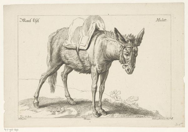 Curator: What an intriguing little sketch! It feels incredibly immediate and present. Like stumbling upon someone’s private thought, you know? There’s something almost tender in its simplicity. Editor: Indeed. This piece, "Gezadeld paard" or "Saddled Horse," attributed to Joannes Pieter Visser Bender and dating between 1795 and 1813, showcases the artist's deft handling of pencil. The Rijksmuseum holds this diminutive drawing within its collection. Curator: Deft, yes, but I think there's something more than just technical skill here. Look at the lines! The frantic energy of the marks—it’s not a perfect horse, by any means, but it is so full of life! You can almost feel it breathing. Editor: Certainly, the sketch is defined by a lack of excessive refinement. It reveals the essential form of the horse through a strategic use of hatching and contour, devoid of color or complex tonal modulation. Curator: It is sort of endearing, the slight awkwardness, I almost get the sense that the artist isn't especially focused on accuracy. It feels more like an evocation of horse-ness rather than an attempt at anatomical precision. And I really dig the somewhat barren landscape! Editor: An apt observation, as it raises questions concerning its artistic intent. Is it merely an academic study? Or perhaps a preliminary exploration destined for inclusion within a more ambitious composition? Curator: Maybe it's just a study to develop a method? What really jumps out at me, though, is that saddle! It’s practically shouting, doesn’t it? It is fascinating that there is this emblem sitting so confidently. Editor: Semiotically intriguing. While the context surrounding that particular detail is somewhat inscrutable, it undoubtedly offers an opportunity for multifaceted interpretation. It would also offer insight to understand what those insignia would be. Curator: Well, whatever the artist was aiming for, I’m hooked. This tiny little window into another person’s creative process; that is what it is all about. Editor: Concurred. It is works such as these, born of private musings and imbued with artistic intent, which remind us that within even the slightest sketch resides a profound potential for compelling expression.