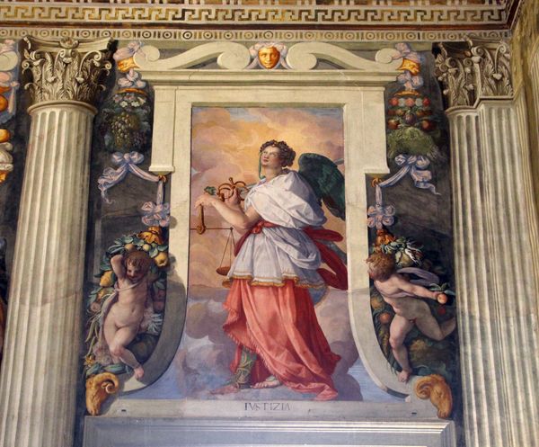 Curator: Let’s explore Alessandro Allori's "Glory," a fresco dating back to 1582. Its composition, encircled by sculptural elements, strikes me instantly with its ambitious ornamentation. Editor: Yes, the ornate details are the first thing I notice, almost overwhelming the central figure. There’s a density to the composition, but the linear elements provide clear structure. Curator: Note how Allori blended painting with sculpted decoration – figures draped over the frame, effectively blurring boundaries. This speaks to the Mannerist artists’ attempts to subvert traditional hierarchies of media and skill. Editor: From a purely formal perspective, I'm interested in the layering of forms here—the painted figures encased by the simulated stonework. The trompe-l'oeil effect draws my eye. It complicates the surface and asks us to question pictorial space. Curator: Considering Allori's position within the Florentine art scene, heavily influenced by the Medici court, we can view "Glory" as a conscious performance. The work functions to communicate an aspirational ideology connected to governance and power. The abundance on display and the putti offering fruit signal to prosperity brought about through noble actions. Editor: Looking at the color palette and figuration, one detects that Mannerist influence you mention in Allori's exaggerated elegance. The figure's elongated form and theatrical gesture suggest a deliberate deviation from Renaissance naturalism. The use of color contributes to a stylized feel that sets it apart. Curator: Absolutely. The intense colors, somewhat unnaturalistic flesh tones, and complex arrangement challenge High Renaissance ideals of harmony and balance. It underscores a desire to impress upon the viewer a certain kind of social message, that’s why there is abundance everywhere, in materials and symbols. Editor: Despite this complexity, there’s an underlying harmony achieved through repeated motifs and carefully balanced colors. I think it offers a visually engaging study of contrast, in technique and form. Curator: It truly encapsulates how the late Renaissance was reinterpreting its legacy through conscious ornamentation, in service of shaping particular socio-political values of the time. Editor: A fitting encapsulation indeed. Thanks to the combination of careful analysis and some visual clues, we were able to dive in and see through the creative process, I think.