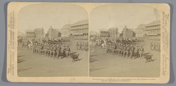 This photograph captures a scene in Pretoria, showing Boer prisoners being led into the city. The composition is dominated by a dense crowd filling the central space, creating a powerful sense of mass and confinement. The sepia tones and subdued lighting emphasize the somber mood and historical distance. The artist's strategic use of perspective draws the eye towards the background, where the architecture of Pretoria frames the mass of figures. Lines of buildings on either side create a funnel effect, directing the viewer's gaze and accentuating the overwhelming number of prisoners. This visual structure serves not only to document a moment in history, but also to evoke feelings of oppression. Note how the formal elements work together to produce meaning, conveying the weight of the event. Photography's inherent capacity to replicate and disseminate imagery contributed to shaping public perceptions during this era. The photograph acts as a signifier, laden with historical and cultural meaning beyond its visual depiction.